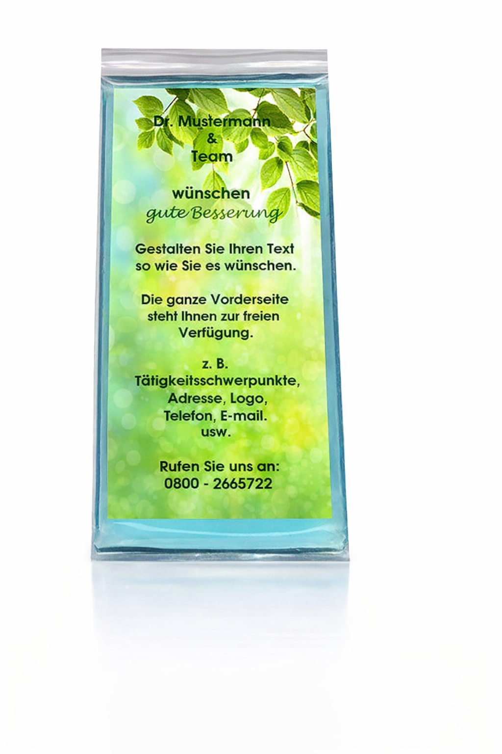 Was unsere Kompressen mit der "mitschwimmenden" Branding-Karte so besonders und einzigartig für Praxen macht, ist die dauerhafte Präsenz Ihrer Werbung. Im Gegensatz zu anderen Kompressen, bei denen der Aufdruck auf der Außenseite mit der Zeit verblasst oder abgerieben wird, bleibt Ihr Branding bei uns durch die innovative "mitschwimmende" Karte im Gel jederzeit klar und deutlich sichtbar. Dies sorgt für eine langanhaltende und effektive Markenpräsenz, die Ihre Patienten auch während der Anwendung stets vor Augen haben.